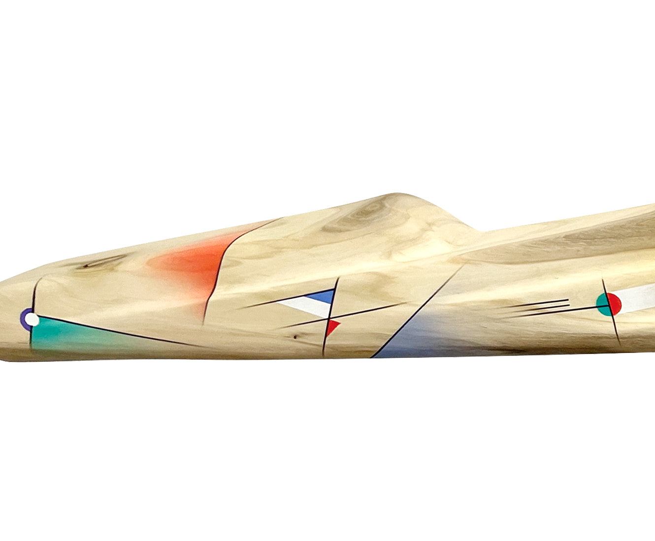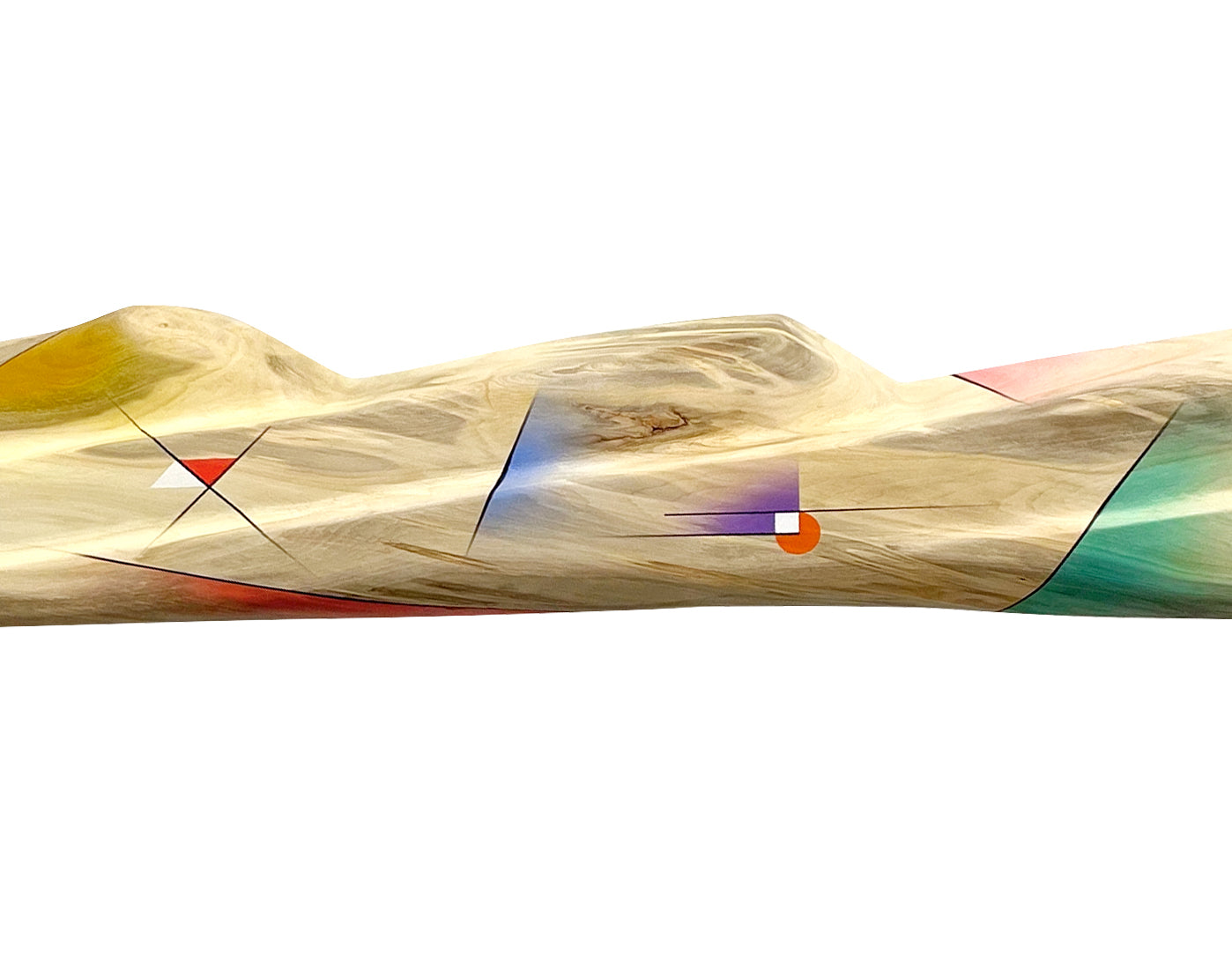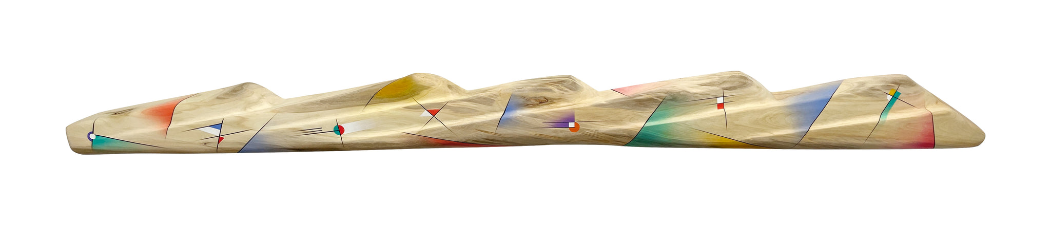 5 Peaks is a painted wood sculpture carved from the trunk of an aspen tree. It is sculpted in the shape of peaks with accompanying ridges. Abstract forms are airbrushed with acrylic paint along the mountains.