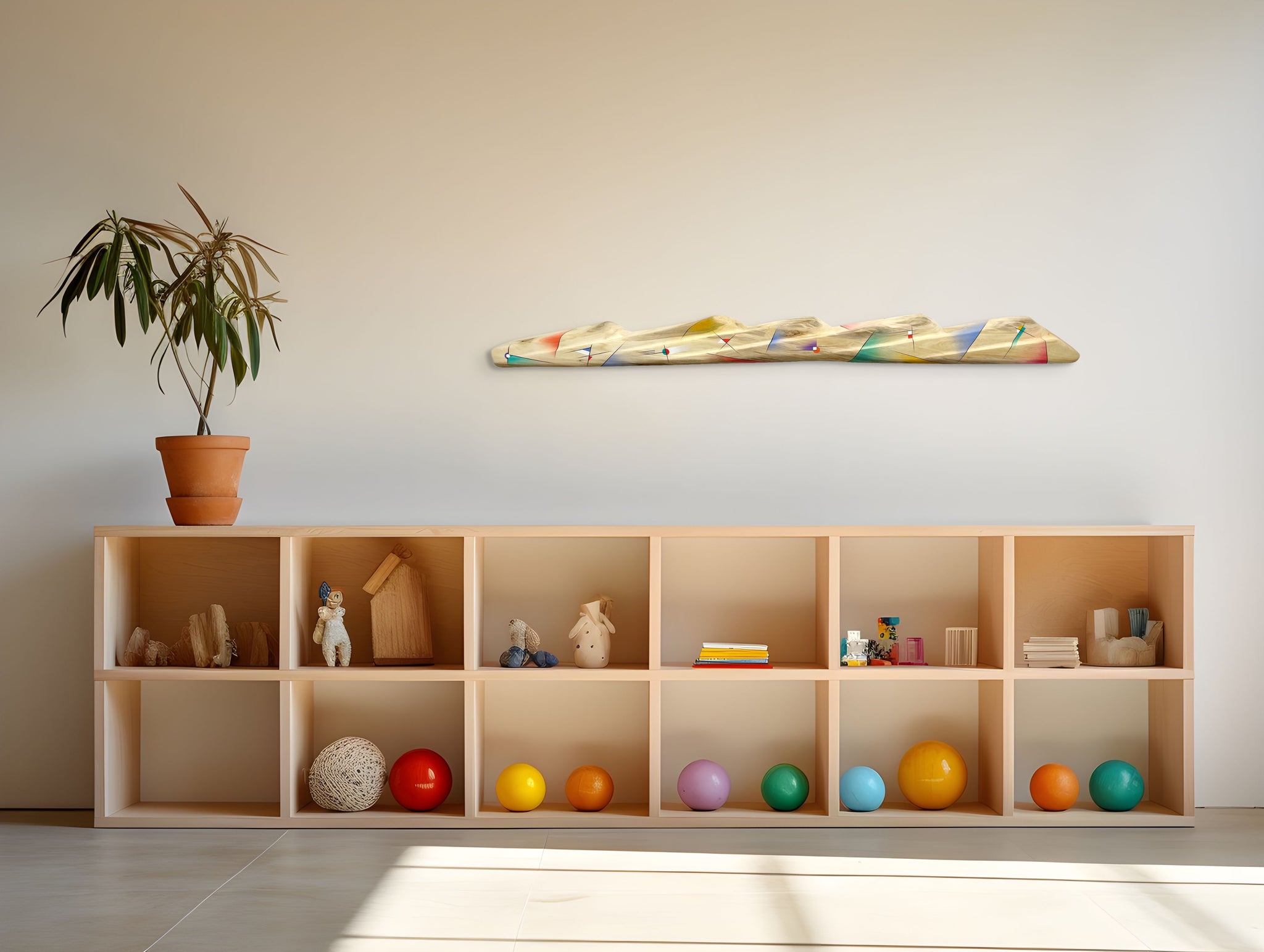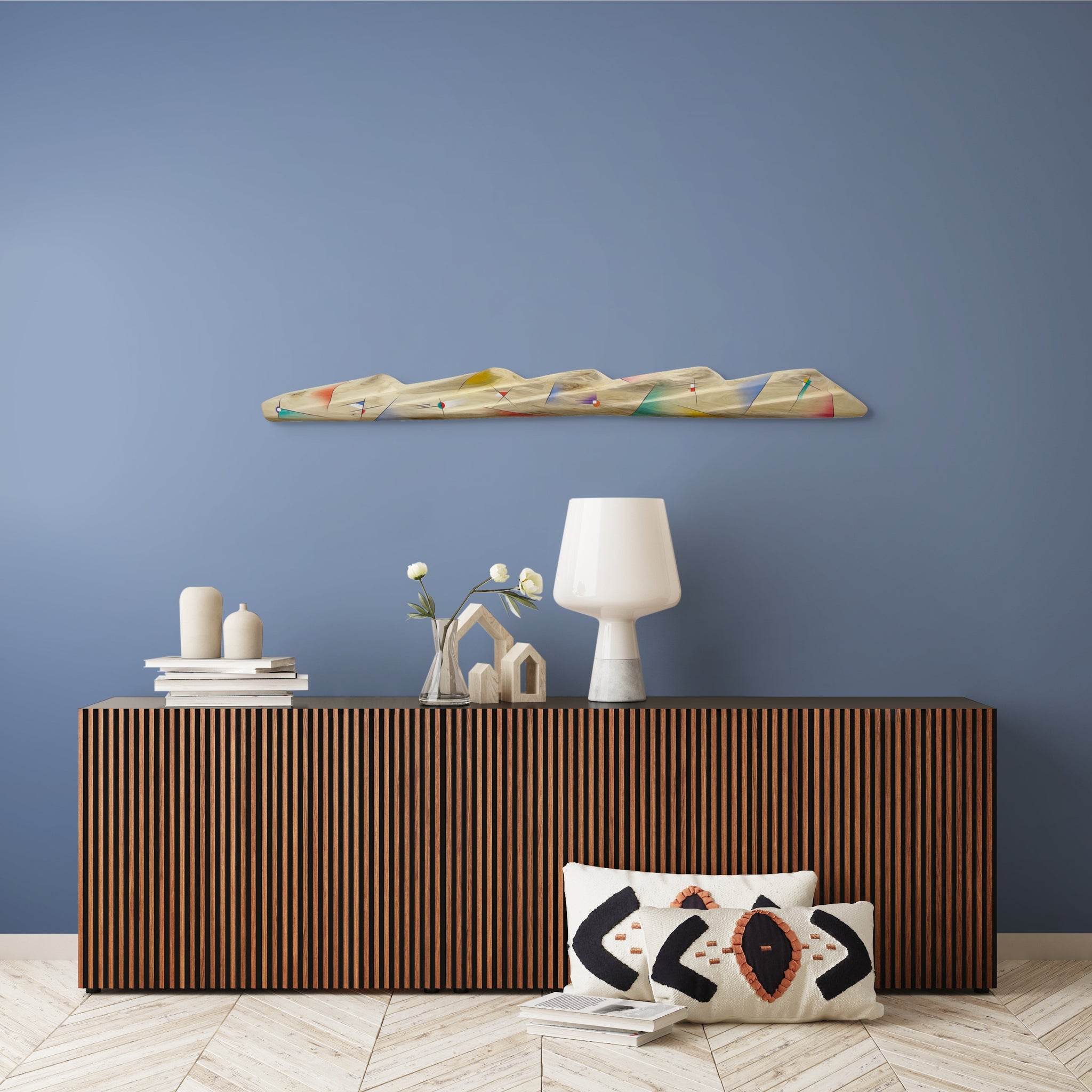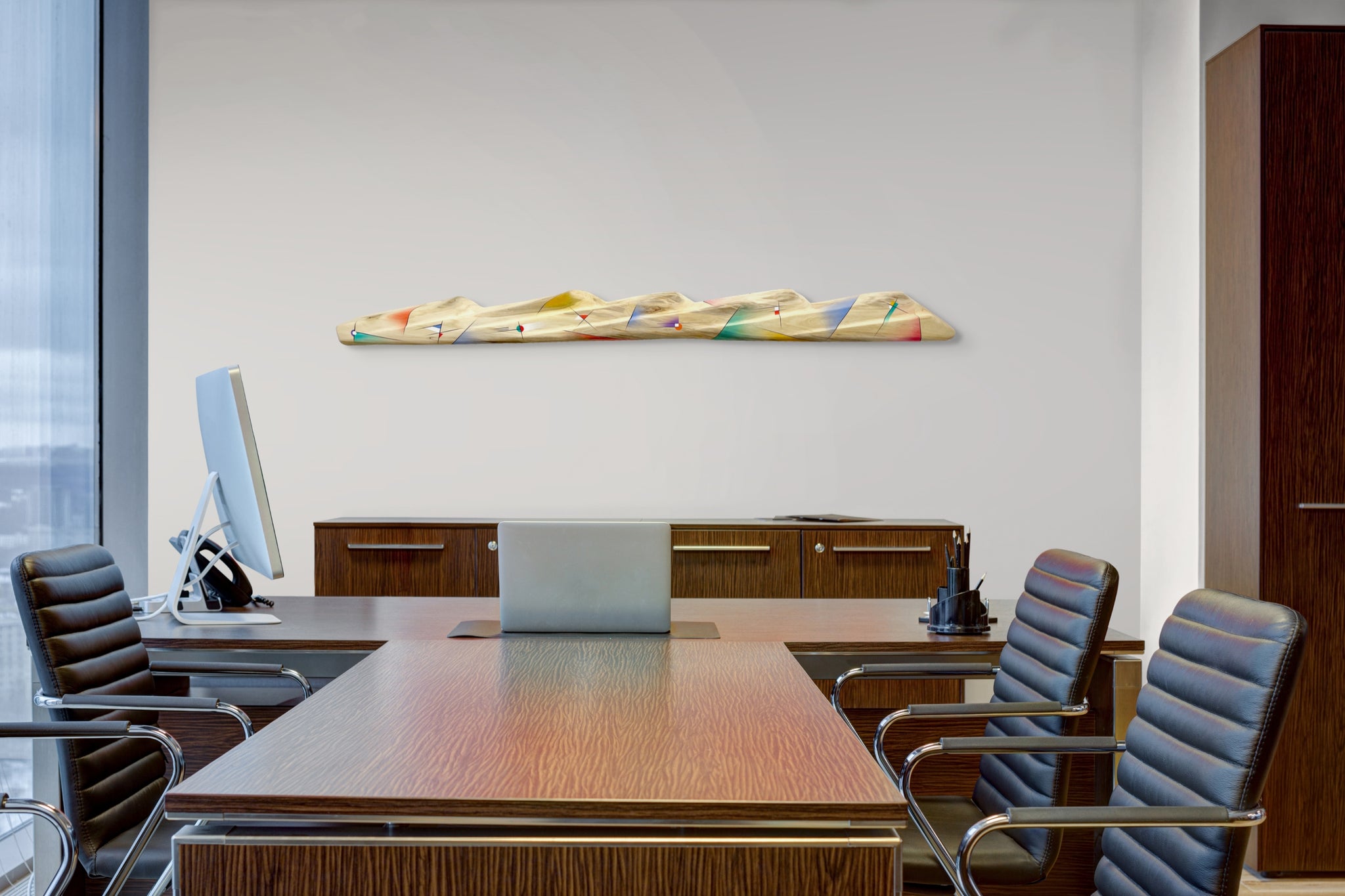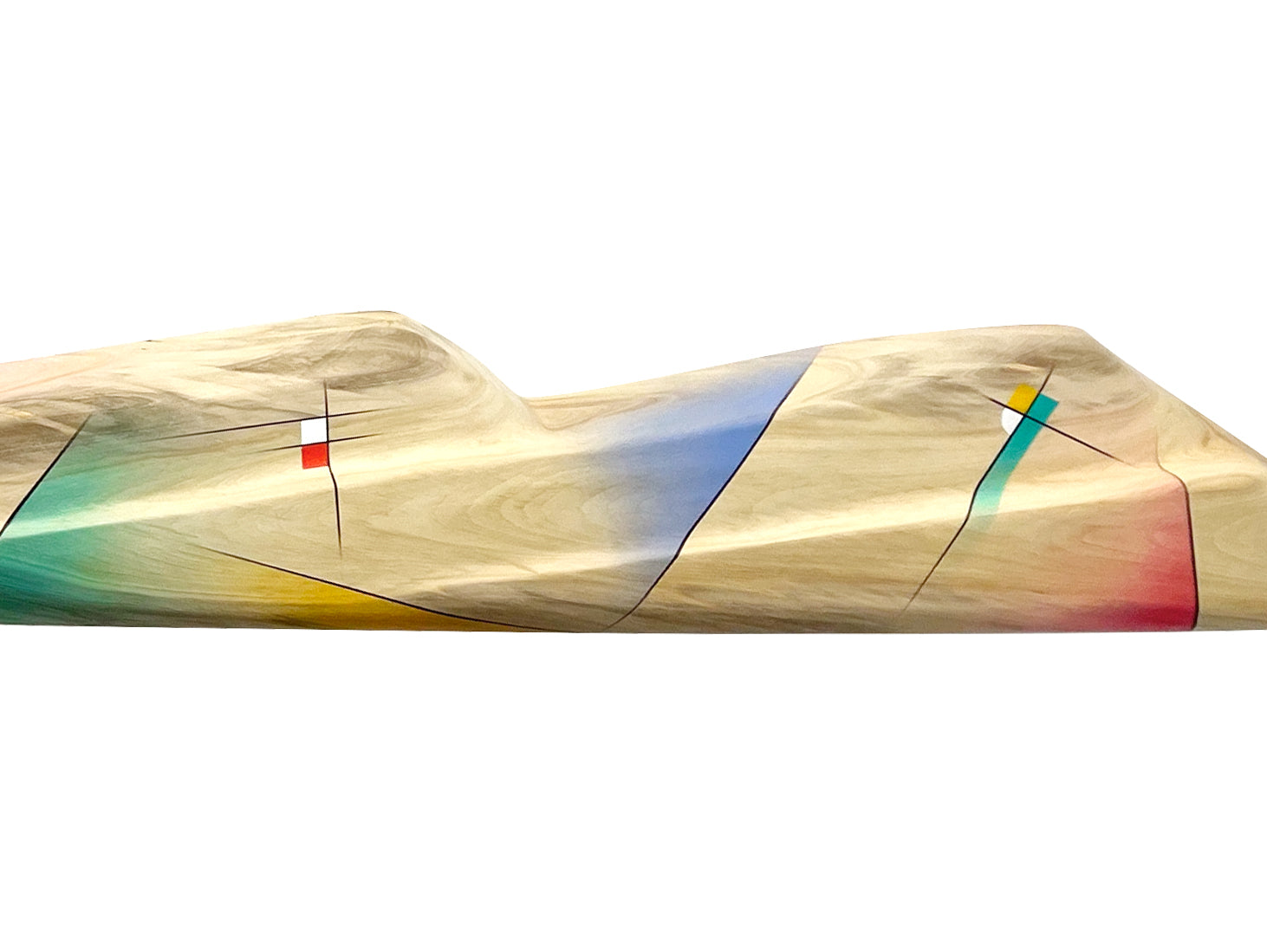 Abstract forms are airbrushed with acrylic paint along the mountains. The unpainted areas along with the airbrushed gradations of color reveal extensive patterns of the aspen's grain. The piece is matte varnished. A french cleat holds it flush to the wall. Once the Wall-side Cleat is leveled and screwed into the wall, the Sculpture-back Cleat fits into the wall cleat so that the sculpture is leveled.
