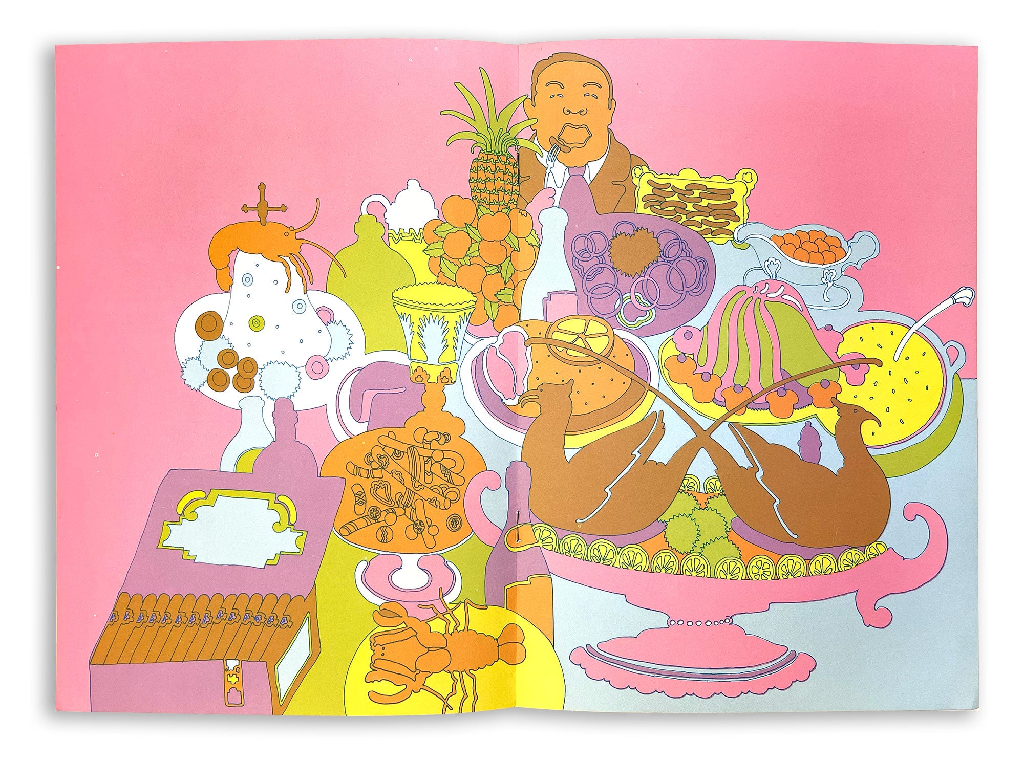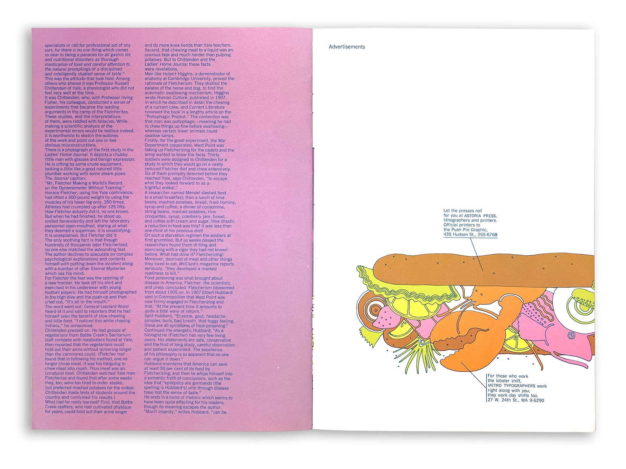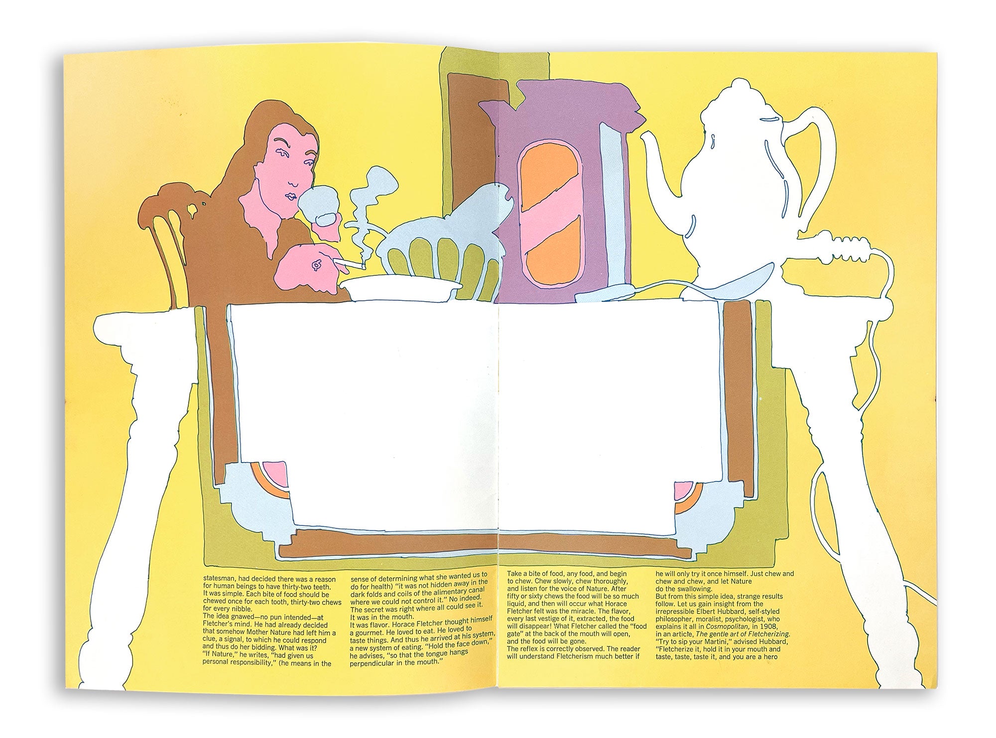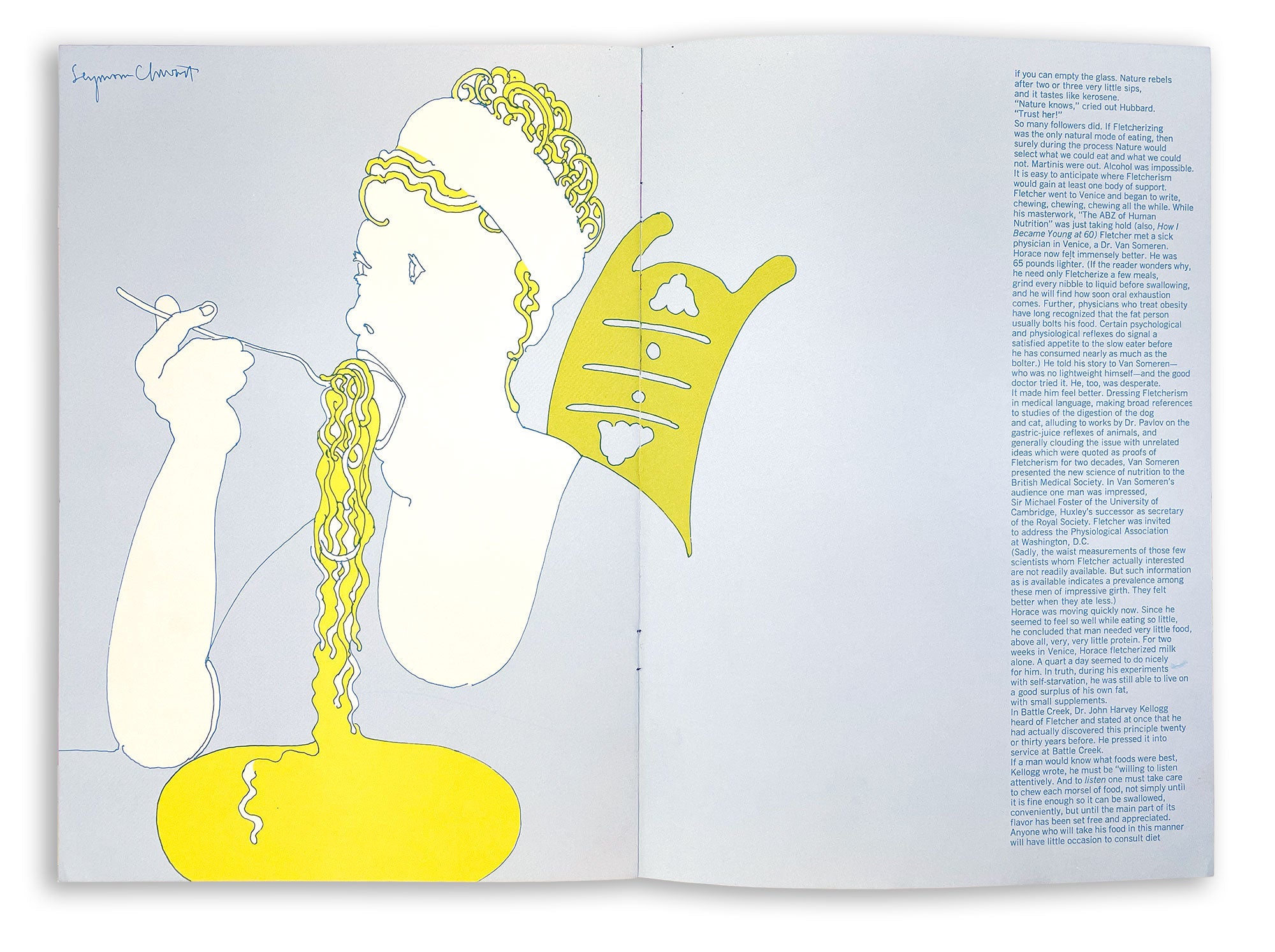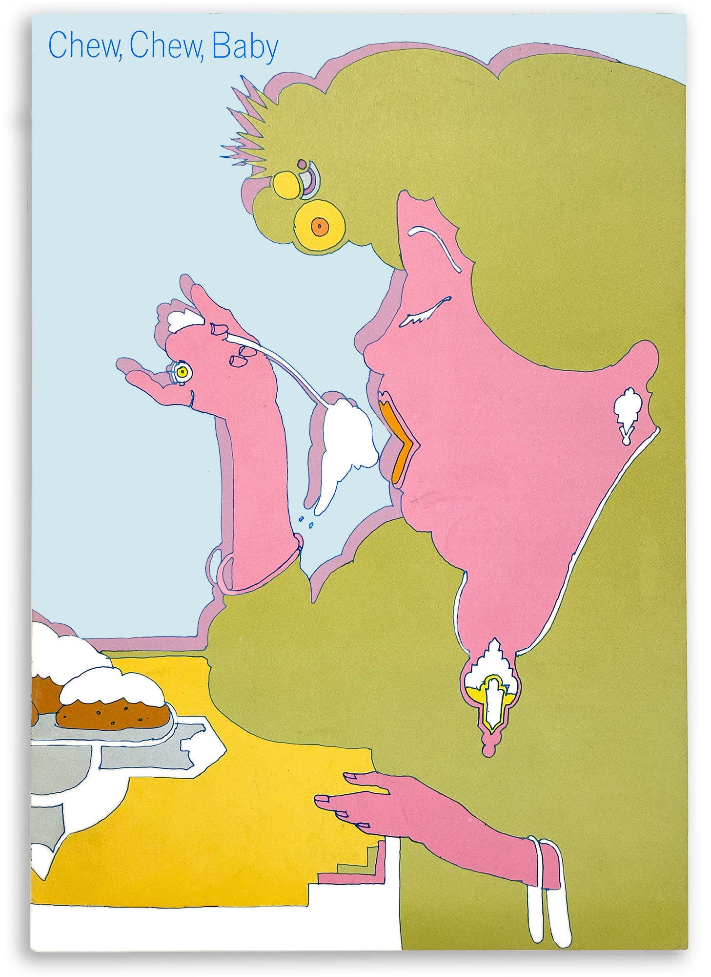 Chew Chew Baby: Push Pin Graphic No. 53, created in 1967. 10.75" x 7.5". Designed by Seymour Chwast. 12 pages including cover. The text is about the ideas of Horace Fletcher, a 19th Century advocate for the health benefits of proper and thorough mastication. It is quoted from "The Nuts Among the Berries" by Ronald M. Deutsch, 1961. I have only one copy of this booklet. I acquired it in the late sixties. Shipping in the US included.